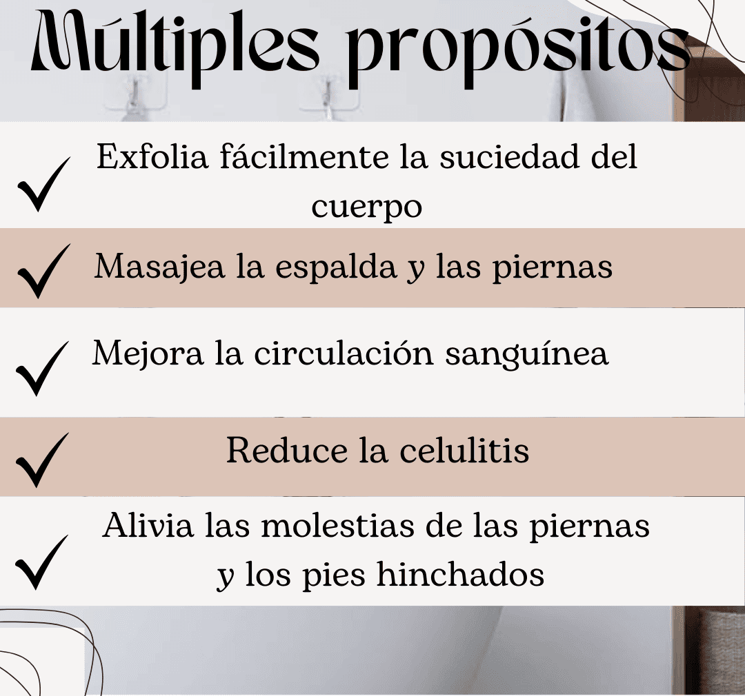 Elimina impurezas, masajea la espalda y las piernas, ayuda a disminuir la celulitis, mejora la circulación y alivia la hinchazón en piernas y pies.