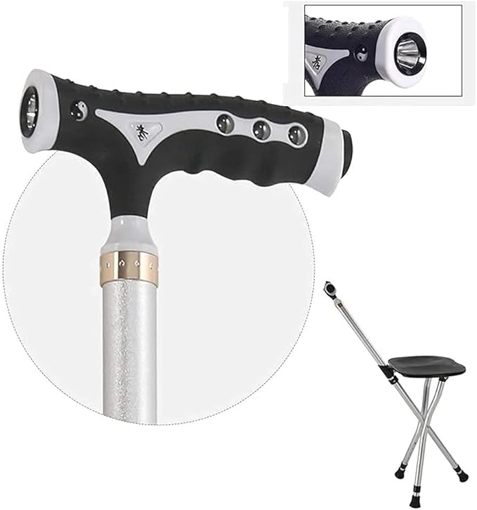Este bastón innovador se transforma en una silla en segundos. Simplemente despliega las patas retráctiles y tendrás un asiento cómodo donde sea que estés: en una fila, en un parque, en la calle o esperando transporte.